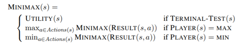 이러한 게임을 어떻게 하면 최대한 이득을 얻을 수 있을까요? 이 문제를 풀기 위한 알고리즘으로 가장 잘 알려진 알고리즘은 바로 minimax알고리즘입니다. minimax 알고리즘은 아래와 같이 recursive하게 정의됩니다.