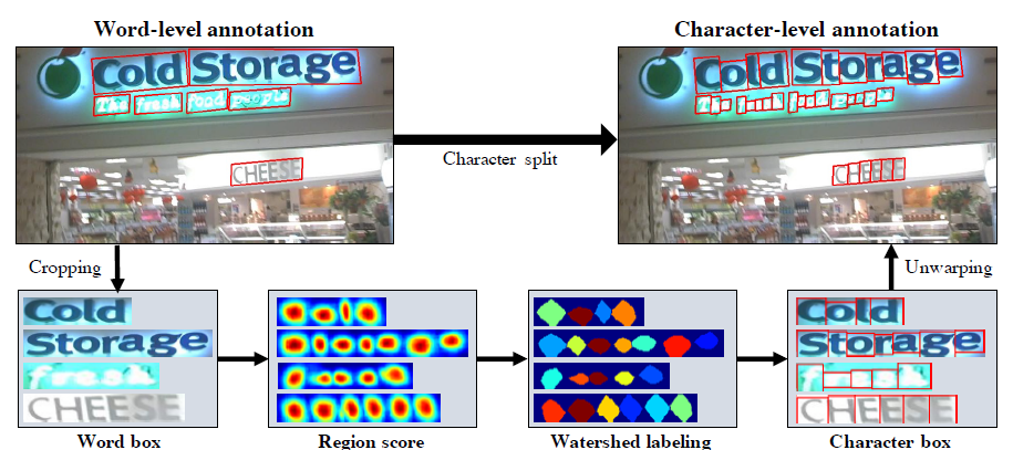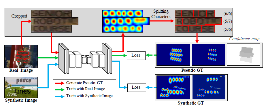 - Weakly-Supervised Learning 활용 : 문자 수준 어노테이션 부족 문제를 해결하기 위해 합성 이미지에서의 문자 어노테이션을 활용하고