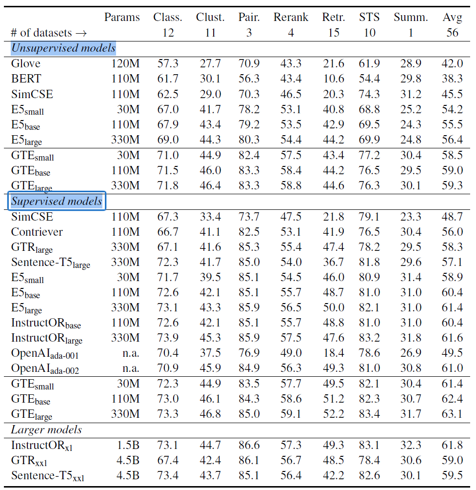 - 특히 GTE_large는 해당 벤치마크 데이터셋에 대해서 SOTA를 찍어 성능 최적화 면에서도 의의가 있음.