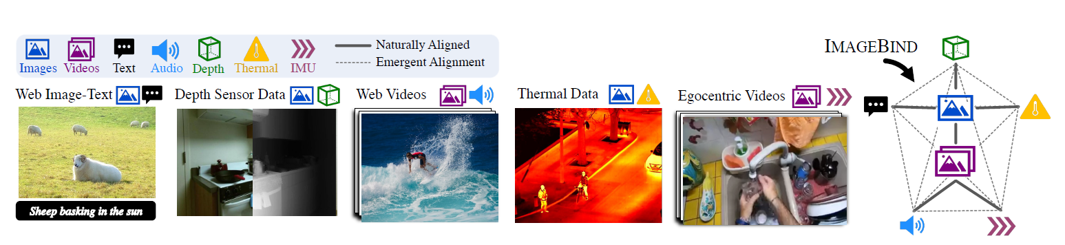이미지를 기준으로 하여 독립적으로 pair-wise하게 학습한 representation들이 사실은 서로도 잘 align된다는 매우 흥미로운 발견이다. (img, txt, audio, video, thermal, depth, imu) 이런식으로 연관된 순서쌍 데이터셋이 있는 것(현실적으로 불가능한 시나리오)도 아닌데도 높은 alignment를 보인다는 것은 놀라운 일이다. 왜 이러한 현상이 일어나는지에 대한 연구가 있을지 궁금하다.
