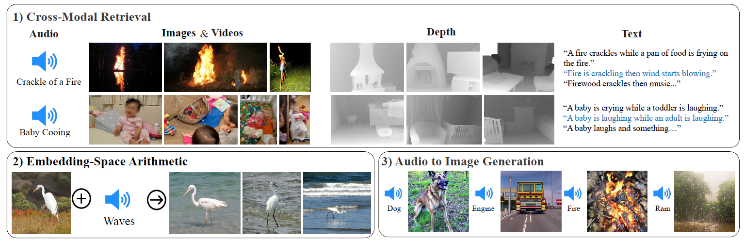 - 이미지와의 5개의 CLIP과 같은 다른 모달리티 사이의 대조학습을 통해 학습이 이루어지지 않은 두 모달리티 사이에도 Fully Connected한 방식으로 정보의 전달이 이루어짐을 실증화해 보인다.